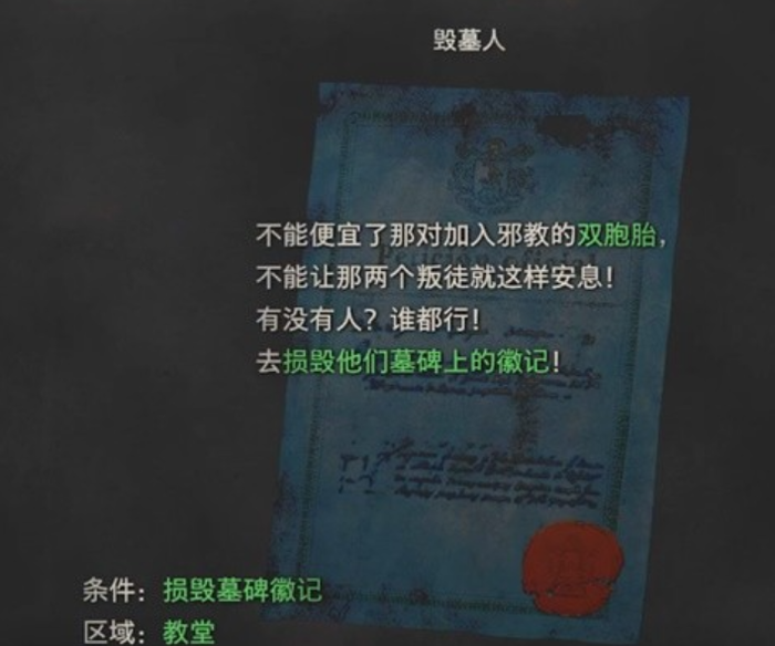 1、毁墓人任务的任务地点在【教堂】场景,大家接取任务之后去教堂位置。