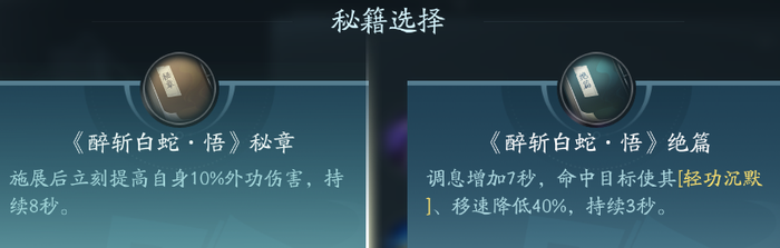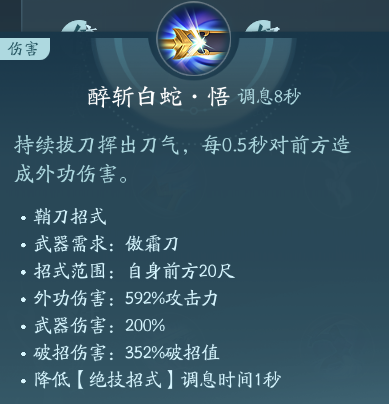 霸刀的主要伤害技能,简称蛇。PVP点绝篇可以封轻功,PVE点秘章增伤。