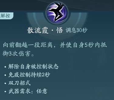移动端霸刀的门派轻功技能,简称散,可以解控也可以抵挡三次伤害并免控。