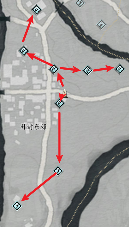 开封东郊附近有8个蹊跷可收集,位置与路线图如下。