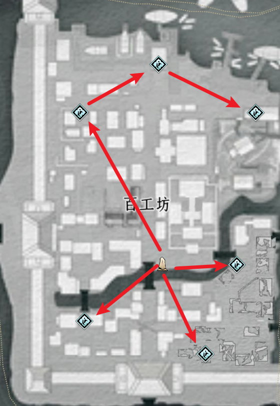 百工坊附近有6个蹊跷可收集,位置与路线图如下。