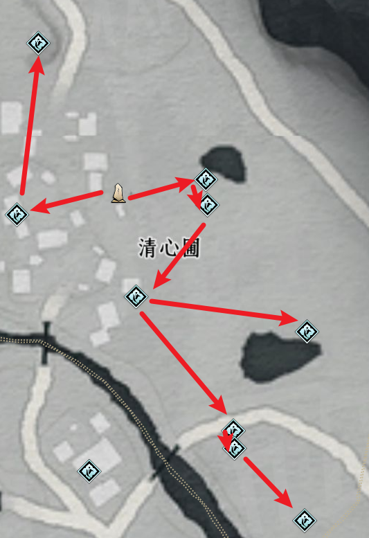 清心圃附近有9个蹊跷可收集,位置与路线图如下。