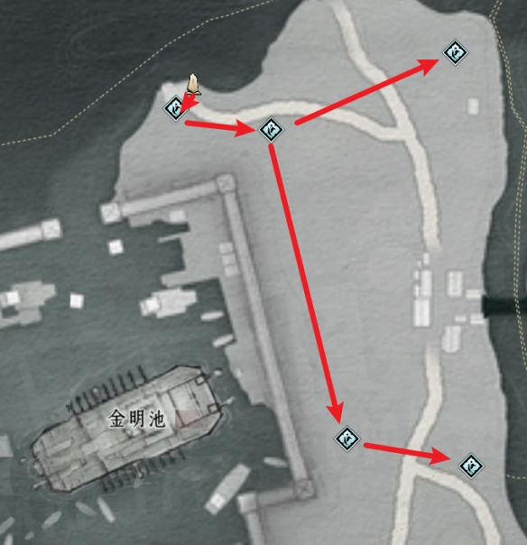 金明池附近有5个蹊跷可收集,位置与路线图如下。