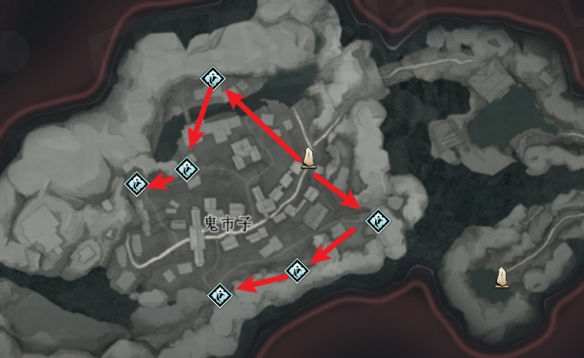 鬼市子附近有6个蹊跷可收集,位置与路线图如下。