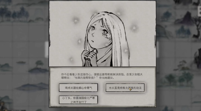 在这个奇遇任务当中,玩家总共有三个选项,第一个选项是为小女孩购买米酒,帮助小女孩驱除寒气,米酒在附近的城镇内,随意找到一个客栈或者是酒馆,就能够花费一千颗灵石购买了,在交付了米酒以后,玩家就能够获得五灵根数值的加成。