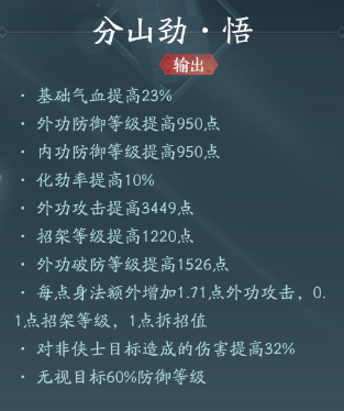 分山劲为外功近战心法,基于属性图可知苍云的主属性为身法,增强身法可以加外功攻击和招架以及拆招,配装方面可以通过堆身法来增加攻击伤害。