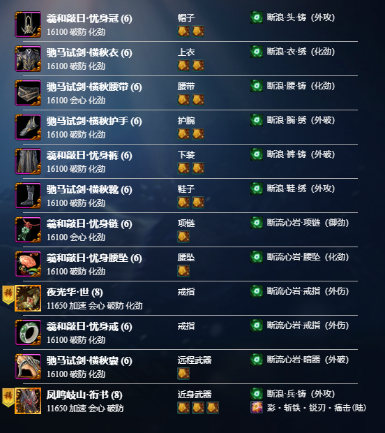 常规竞技场毕业装,苍云与会心联动属性少,因此挑选主破,增强buff破防收益。
