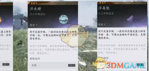 这个道具的效果是给武器添加了一个天物·毒的效果,让攻击附带一个中毒的效果,对于有横练效果的角色有克制效果,当道具达到2级后对命中的目标还会有额外伤害,当道具3级后能够延续10秒的时间。这个道具能够通过采集菌子或者是毒菌获得;