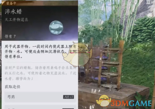 这个道具的效果是给武器添加一个天物·水的效果,让攻击附带一个沉滞的效果,能够对带有盾的角色有好的克制效果。当道具等级达到2级后,能够在附带效果的阶段提升防御能力,3级的效果是延长附带效果时间10秒。这个道具能够在不羡仙附近的水域获得;