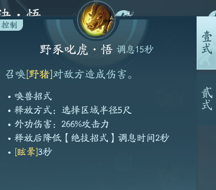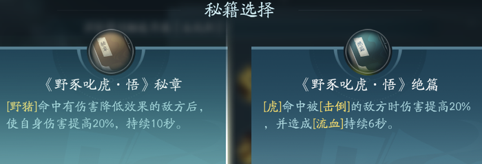 这是一个有两段技能的召唤技能,一段能够召唤一个野猪,二段能够召唤出一只老虎。这两个秘籍都适合PVP携带,在二段减疗后控制或者增伤,PVE重点的话点绝篇。