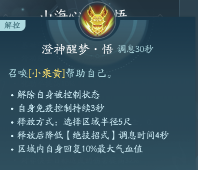 召唤出小乘黄,万灵本体能够解控也能够续免控3s。PVP点绝篇帮队友也续免控,PVE点秘章,但是实际作用不大。