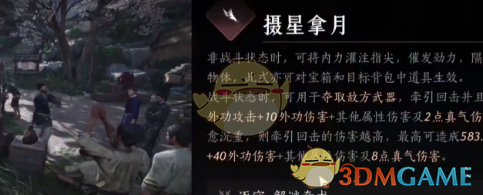 这是一种远程拾取物品的奇术,能够隔空摄取目标物品,在场景互动和战斗中都能发挥重要作用。在场景中,它能够用来从远处取物,比如隔着毒蛇拿取任务包裹等。而在战斗中,“摄星拿月”能够直接夺取敌方的武器,并对目标造成高额外功伤害。想要获得“摄星拿月”,玩家须要跟随主线任务前往神仙渡,在酒摊附近的空地上找到NPC仇越海,触发相关剧情并完成指定任务,即可解锁这一奇术。