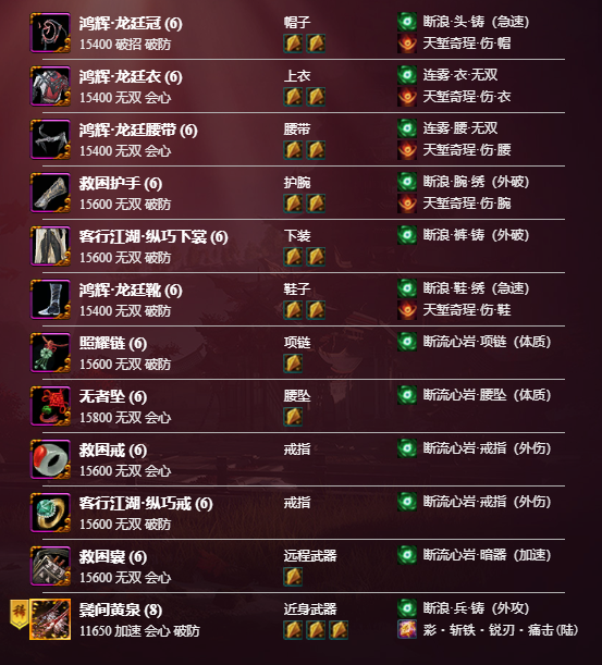 本套装备的亮点是可以到达72的破防和27的会心,在实战中机动性高,伤害能打的更高并且适合平民玩家。