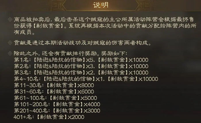 3、活动结束后,会根据活动战功+贼寇伤害来排名,前400名的奖励是比较好的,401名之后都是剿敌赏金X2000的奖励。