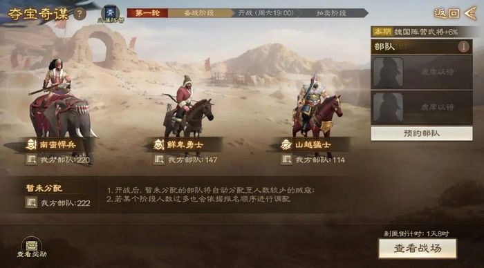 点进去之后可以看到三个BOSS,分别是南蛮悍兵、鲜卑勇士、山越猛士。你能选取操作的,就是预约自己两个部队,继而选取打哪个BOSS而已。