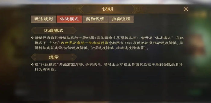 4、另外还有一个值得说明的是休战模式,这个休战模式大概会在周六下午三点左右就开始,一直持续到活动结束,大概是晚上九点左右,这个休战模式的DEBUFF大概可以想象成夜战模式,战功这些都只有10分之一,这个时候保留兵力等活动就是了,务必保证活动开始时你的两个预约部队不在战斗中而且满状态。