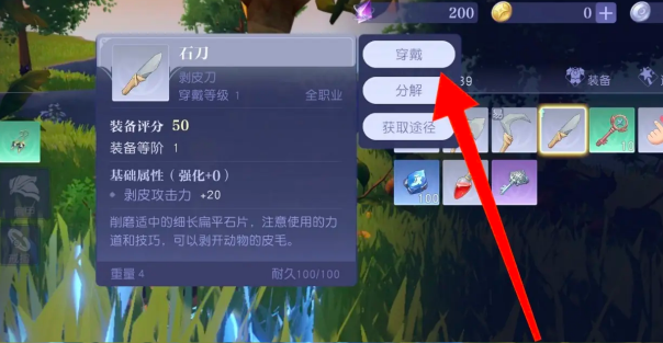 3、点击【石刀】并选择【穿戴】选项,装备石刀。
