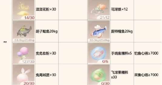 3、其他材料:根据心得等级解锁采集、清洁、钓鱼、捕虫等任务获取。