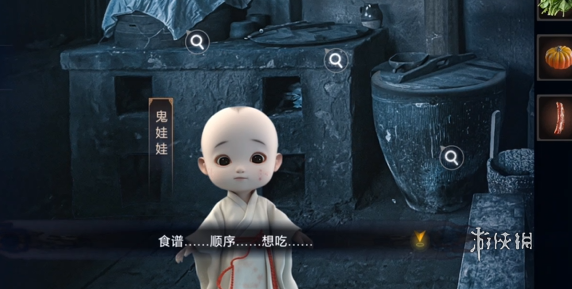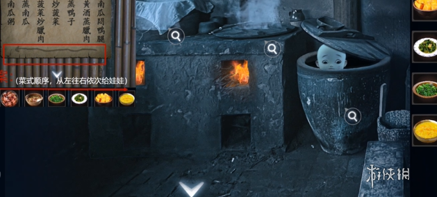 22、按照食谱顺序,依次把南瓜焖鸭腿(需要男主放)、黄酒蒸腊肉、炖鸭子(需要男主放)、炒菠菜、菠菜炒腊肉、蒸南瓜和南瓜粥交给鬼娃娃。