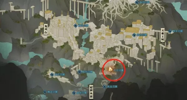 1、前往天羲遗城的圣辉祭坛,然后在图示位置的三个红圈里找到三根赤金羽。