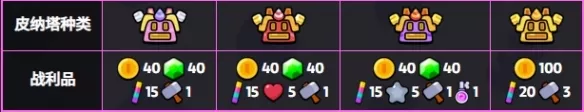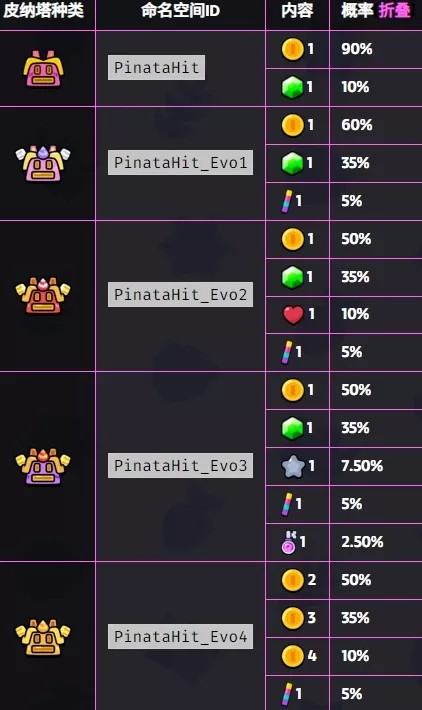 不一样的巨大皮纳塔的造型和皮纳塔狂欢活动的进度里程碑一致。其包含的奖励也和自身颜色有关,比如红色皮纳塔会掉落红色的爱心;紫色皮纳塔会掉落钥匙;黄金皮纳塔不会掉落宝石,只会掉落金币。