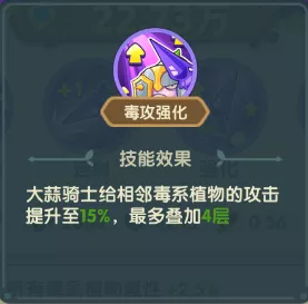 攻击速度:0.56 占用格子:5格 被动技能: 场上与大蒜骑士相邻的毒系植物攻击 8%,最多叠4层
