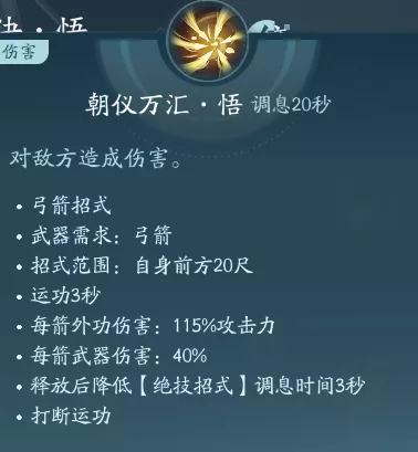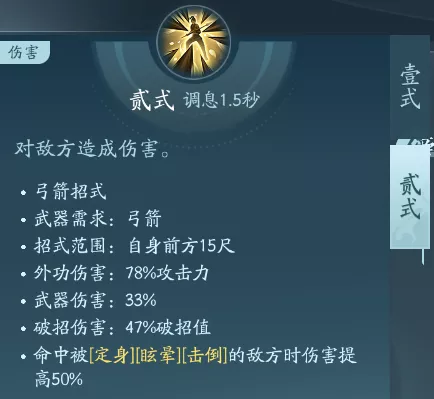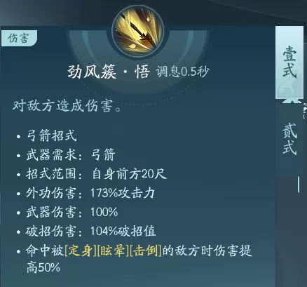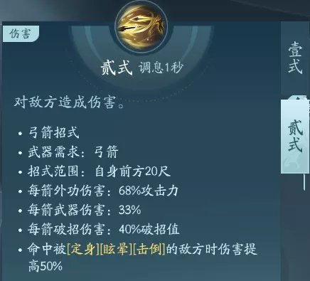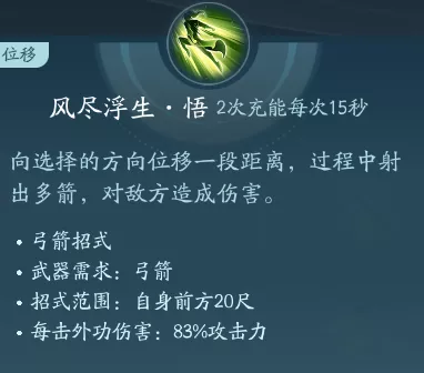 射出箭矢普攻,一共有两段技能。PVP可行点绝篇,PVE点秘章增伤