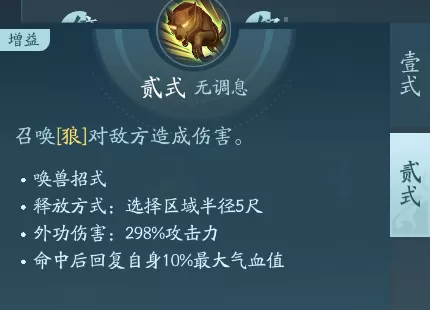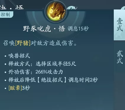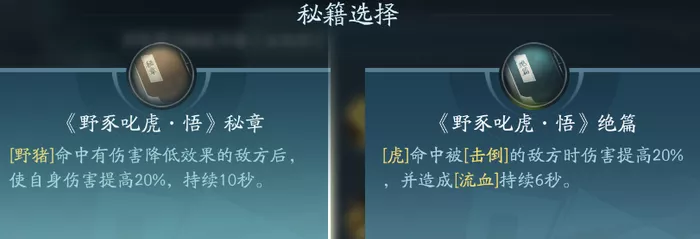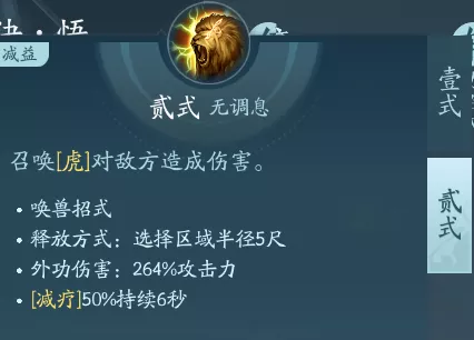 这是一个有两段技能的召唤技能,一段可行召唤一个野猪,二段可行召唤出一只老虎。这两个秘籍都适合PVP携带,在二段减疗后控制或者增伤,PVE重点的话点绝篇。