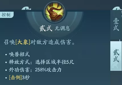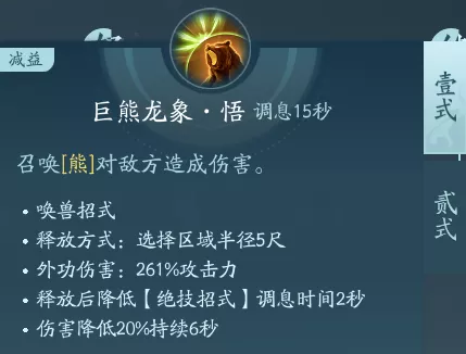 召唤技能,一段召唤出一头熊,二段召唤出一头大象。PVP点秘章封内,PVE点绝篇增伤。