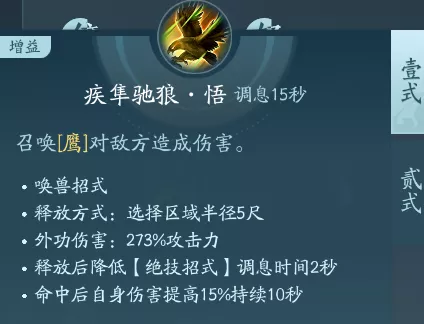 召唤技能,一段召唤一只鹰,二段召唤出一头狼。PVP可行点秘章,PVP点绝篇。