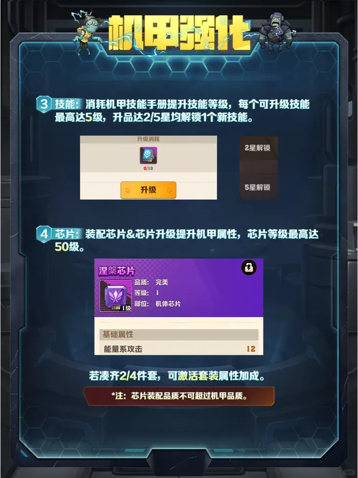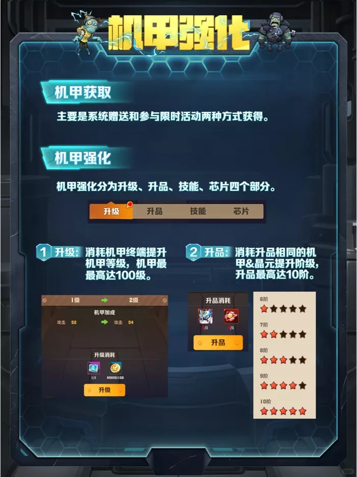 机甲:可进行升级、升品、解锁技能、装配芯片以及上阵编辑。