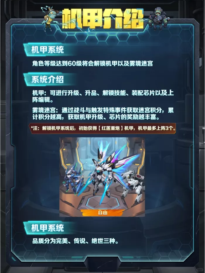 *注:解锁机甲系统后,初始获得【红莲重炮】机甲,机甲最多上阵3个。