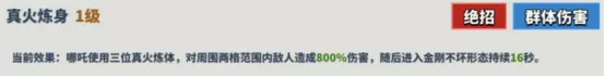 描述:哪吒运用三位真火炼体,对周围两格范围内敌人造成800%伤害,随后进入金刚不坏形态持续16秒。