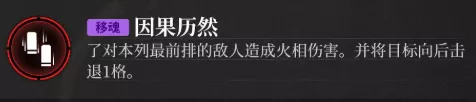 了对本列最前排的敌人及其身后1格的敌人造成火相伤害。自身生命值低于50%时,本技能造成的伤害增加。技能施放后回复自身最大生命值。
