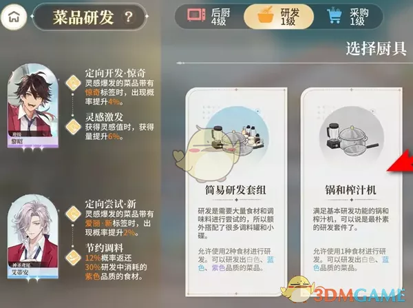 2、继而进去研发玩法,利用锅和榨汁机这个厨具进行研发;