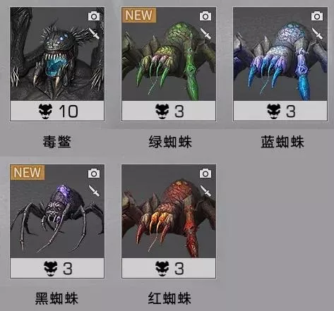 新增:毒鳖、绿蜘蛛、蓝蜘蛛、黑蜘蛛、红蜘蛛