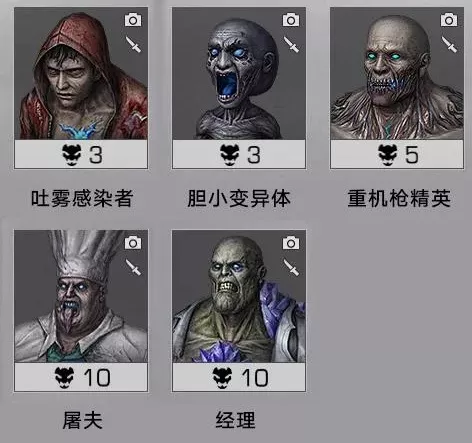 在万国酒店中幸存者将收集到吐雾感染者、胆小变异体、重机枪精英、屠夫、经理等怪物图鉴。
