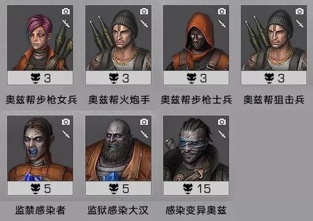 在至暗牢狱中,幸存者可行收集奥兹帮步枪女兵、火炮手、步枪士兵、狙击兵、监禁感染者、监狱感染大汉以及感染变异奥兹等新怪物图鉴。