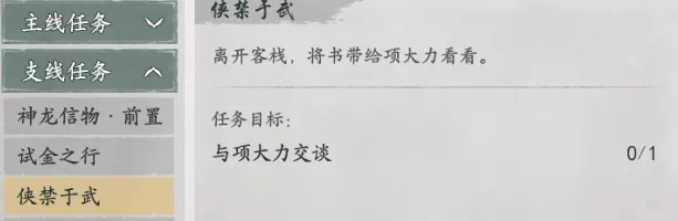 触发条件:完成主线任务 五章·烽烟七(与苏芊芊会和),以及支线任务:侠禁于武(与大力交谈)