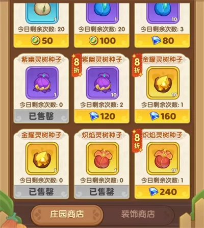 在七级庄园商店便能解锁炽焰种子的购买,其余的种子在前期庄园币不多的时候推荐只买紫幽灵树的种子,它和金耀灵树种子产出的道具近乎一样,只是产出庄园币、经验的数量有差距。