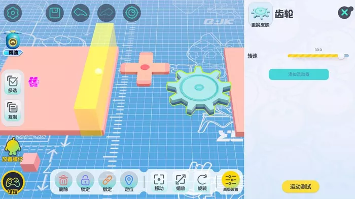 【机关组件】的详情界面中能够调整该组件的运动及其他属性参数,不一样的机关会有不一样的参数能够调整(比如齿轮能够调整转速)