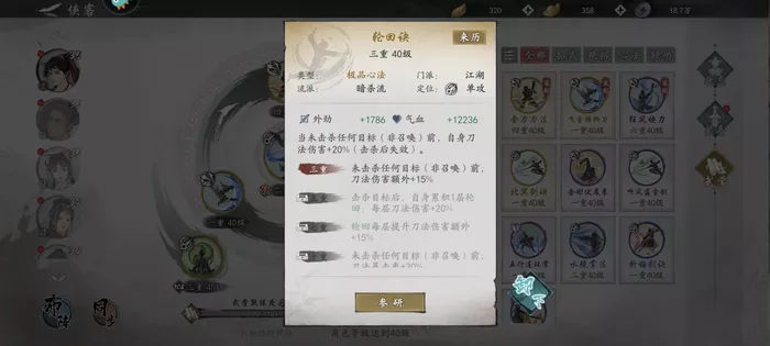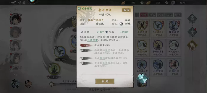外功其实就要比内功伤害高,天涯浪迹刀搭配轮回诀应该是这个游戏里伤害最高的技能,还带斩杀效果,飞雪拂柳刀搭配素心影闪避特别稳定,金刀刀法搭配狂风快刀吸血也特别可观,游戏后期技能升级后攻击距离两格,绝对是三体人,前期金刚伏魔拳和秋风扫落叶换掉飞雪拂柳刀和素心影也允许,金刀刀法和狂风快刀是一格距离群攻技能允许吃满,阵容就需要三保一,如果是闪避对阵容就不太严苛