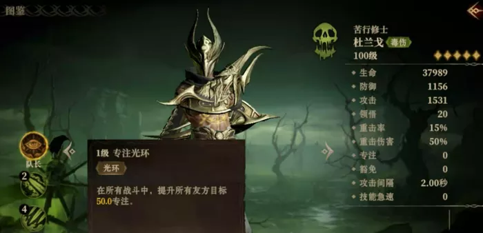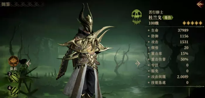 杜兰戈的被动技能可以说是他的一个杀手锏,让开局变得十分有利。作为游戏中为数不多的能让角色开场就直接出手的技能,杜兰戈的被动不仅能让他抢先对敌方全体进行一次攻击,还能给敌人施加一个毒伤状态。这意味着毒系队伍可以在开局阶段就开始铺垫毒伤,为后续的爆发打好基础,简直是一举两得。