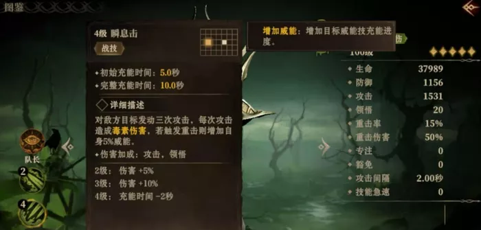 虽然杜兰戈的战技看起来似乎有些简单——单体攻击、伤害增强,听起来也许不够吸引人,但实际上,这项技能却在高攻击加持下爆发出极强的伤害,尤为是在击中敌人的要点时刻。更为重要的是,杜兰戈的战技有一个极为有趣的机制:每次攻击如果触发重击效果,都会为杜兰戈给予5%的威能增强。理想情况下,三次战技就能让威能增加高达15%,这让杜兰戈的输出能力进一步增强。而且,随着威能增强,杜兰戈的毒伤会更加致命,对敌人造成的压制效果也会更强。