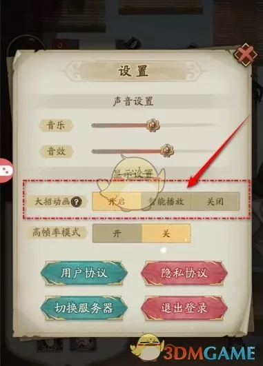 3、最终在设置页面,点击大招动画,选择开启、智能播放、和关闭进行设置即可。