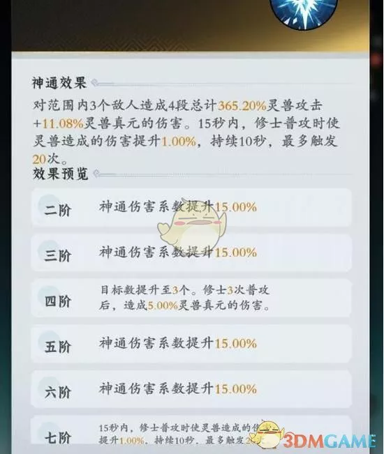 灵兽所拥有的神通,即为其技能。每种灵兽拥有三大神通,除了初始神通外,其余神通将随灵兽境界的提高而逐一解锁。这些神通可通过灵渺界的开灵露和点化玉进行提高。每当灵兽的神通达到10级倍数,便能打开不同层次的效果。