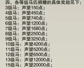 1、玩家可通过上缴任意马匹把声望增强到【友好】,以后则需要给予对应等级的马匹才能加声望;