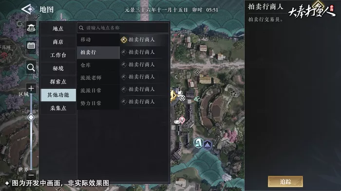 若您被京城的胜景迷了双眼,难识东南西北,能够开启世界地图,点击左方放大镜图标,即可找到拍卖行的位置,大奉自动导航持续为您服务!