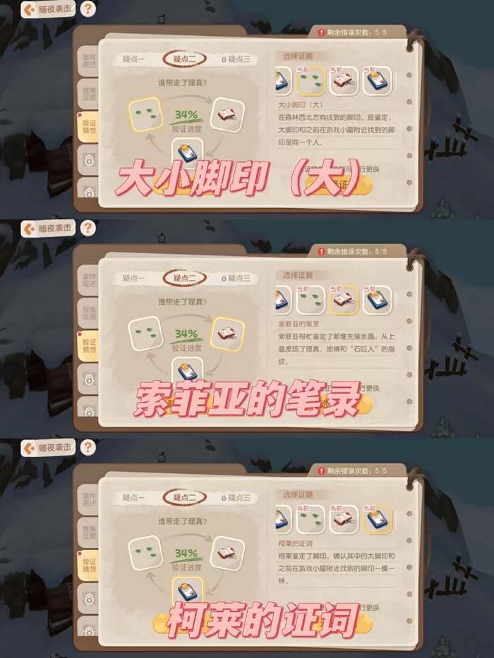 三个证据分别是:大小脚印(小)、失落水晶、柯莱的证词。
