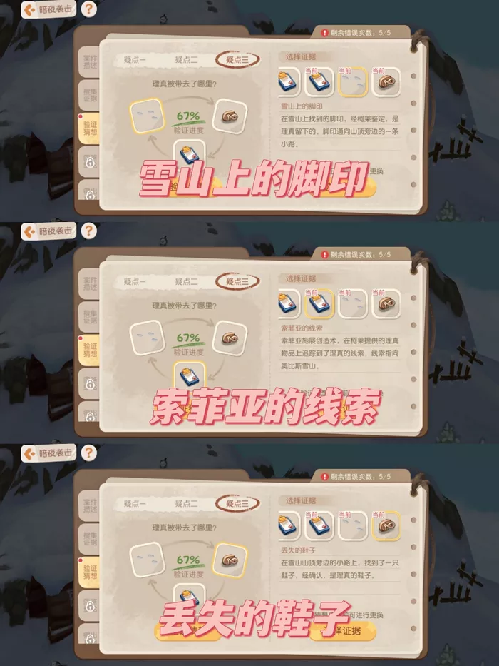 三个证据分别是:索菲亚的线索、雪山上的脚印、丢失的鞋子。